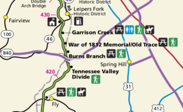 You can hike a 2 mile section of the Old Trace here as part of the Highland Rim Section. This two mile section is relatively flat going through the shaded forest until you start to descend to the Garrison Creek trailhead.
