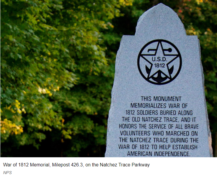 This next stop will be coming up soon at milepost 426 point 3. This is the location of "The War of 1812 Memorial." It honors the service and sacrifice of all brave volunteers who marched on the Natchez Trace during the War of 1812, especially those that are buried in unmarked graves, up and down the Old Natchez Trace. You can tour a section of the original trace at this location.