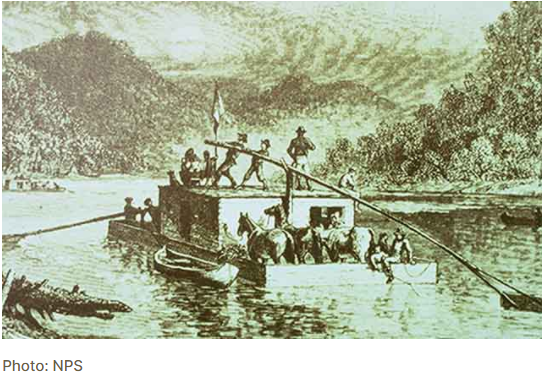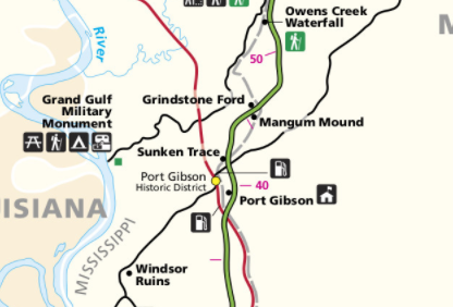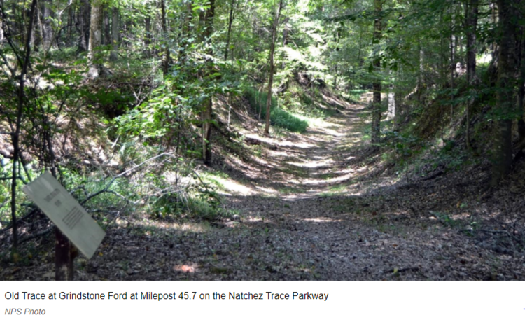This next stop is known as Grindstone Ford - This ford marked the beginning of the Choctaw Nation and the end of the Old Natchez District. The site takes its name from a nearby water mill.