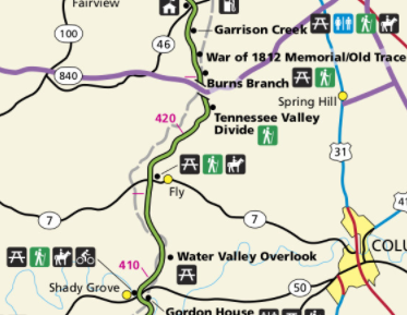 The horse trail, approximately 25 miles in length, is located one mile south of Tennessee Highway 46 near the Leipers Fork Community, within the boundaries of the Natchez Trace Parkway. The trail parallels the parkway from the Garrison Creek comfort station (Milepost 427 point 6) parking/staging area to Tennessee Highway 50/Shady Grove (Milepost 408) parking/staging area.