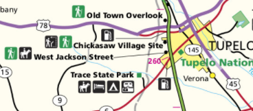 A 3 point 5-mile loop trail is located in southwest Tupelo, Mississippi, within the boundaries of the Parkway. The parking/staging area is accessed from Jackson Street in Tupelo, MS. From the Natchez Trace Parkway, exit onto Highway 6 at Milepost 260. Travel west on MS Highway 6 for approximately ½ mile to Air Park Road. Turn right and travel north to the end of the road at Jackson Street. Turn right on Jackson Street. A paved parking/staging area is on the left.