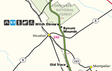The Witch Dance Horse Trail, located in the Tombigbee National Forest, is an 15-mile, multi-loop trail and is one of the most popular horse trails in Mississippi, winding through varied topography and changing forest settings. Toilet facilities, hitching posts, and parking are provided at the trailhead by the Natchez Trace Parkway; the trailhead is located on the Natchez Trace north of Highway 8 at the Witch Dance Rest Area.