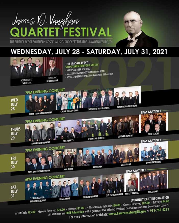 The 2021 James D Vaughan Gospel Quartet Festival will be held Wednesday, July 28 through Saturday, July 31 in downtown Lawrenceburg at the historic Crockett Theater.