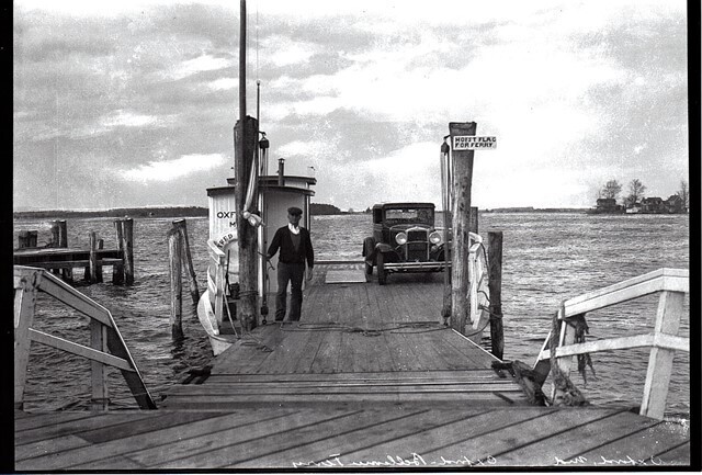 On the waterfront to your left is Oxford’s other great attraction - the Oxford Bellevue Ferry. It is believed to be the oldest privately owned, free-running ferry in the country. The original charter from 1683 said that the ferry was to take “men, materials and animals” from Oxford to a plantation across the river. Supplies were also needed from Oxford by the plantations and businesses on the other side of the Tred Avon River. The service began as a simple barge, powered by a 14-foot oar with some help from a small sail. During the 17-century, travel by water was much easier and less dangerous than traveling by road.