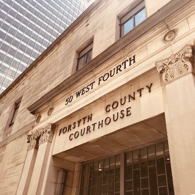 The land the court house stands on once was a town park with several statues resting on each of the four corners. When the state of North Carolina felt a need for a county court, it decided to to build on the location due to the centralize location and proximity to City Hall . The Courthouse is a three-story limestone-sheathed building which was completed in 1926. Later years, the north and south facades were added in 1958-1960, The third courthouse to stand on the site. Northup & O'Brien, a prominent Winston-Salem architectural firm whom designed city Hall and others on the tour. This would be the only courthouse the firm ever designed. Their successor firm, Lashmit, James, Brown and Pollock designed the 1959-1960 additions. If you view the building from the side, the additions can be seen. The roof lines of the additions were lower than the main building. At one time the south side of the building was the main entrance with an expansive green space.