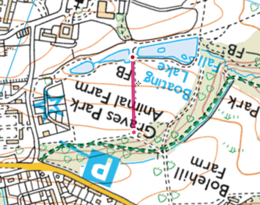 It's worth taking a minute to look around and identify different features and see how they are shown on the map. If you look down the hill from where you are stood, you can see a path that is represented on the map by a black dashed line.