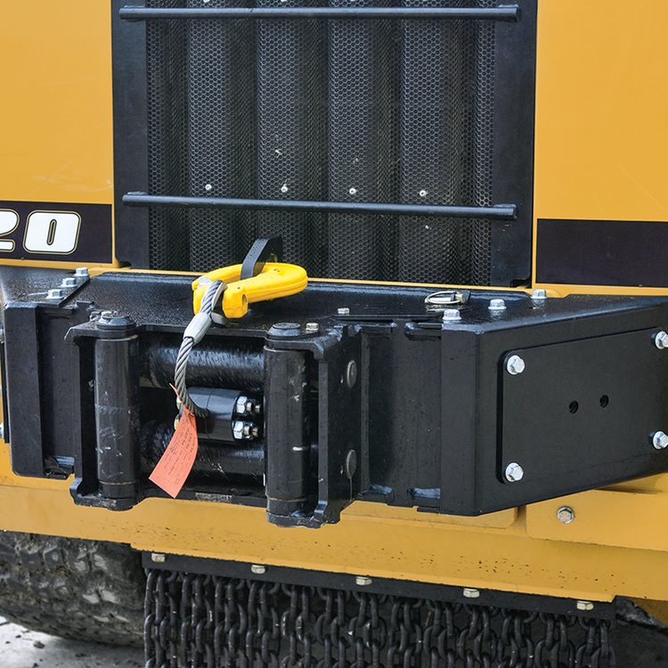 Located on the back of the C120 R Dedicated Forestry Mulcher is the rear-mounted Hydraulic Winch. With a 12,000-pound pulling capability, this feature is ideal for working on a sloped terrain for safety. A nylon tree saver is included and stored in the cab for winching around trees in the event that the machine need to be recovered from muddy terrain.
