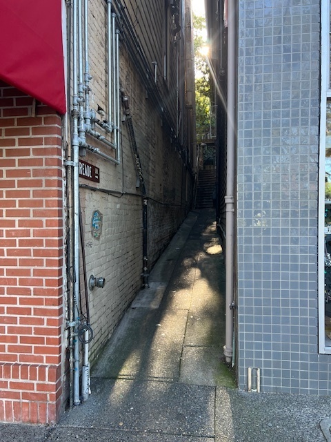 The 1st of three downtown stairways that lead from Bridgeway up to Bulkley Steet. These steps are start on the South side of downtown across from the fountain. The lane is marked with the Reade St. sign inside the narrow alley. The walk starts off giving the impression it is a narrow unwelcoming alley, but soon turns left and opens up to a wider walk and further up to a short paved path up to Bulkley St. From there you can go right to find Excelsior Ln or further left to El Monte Ln, both which will take you back down to Bridgeway. Or you can turn left and walk down to Princess Street, which will also bring you back to Bridgeway. Either direction, you can enjoy short walk reminecent of how the 19th century residence got from downtown to their neigborhood and back.