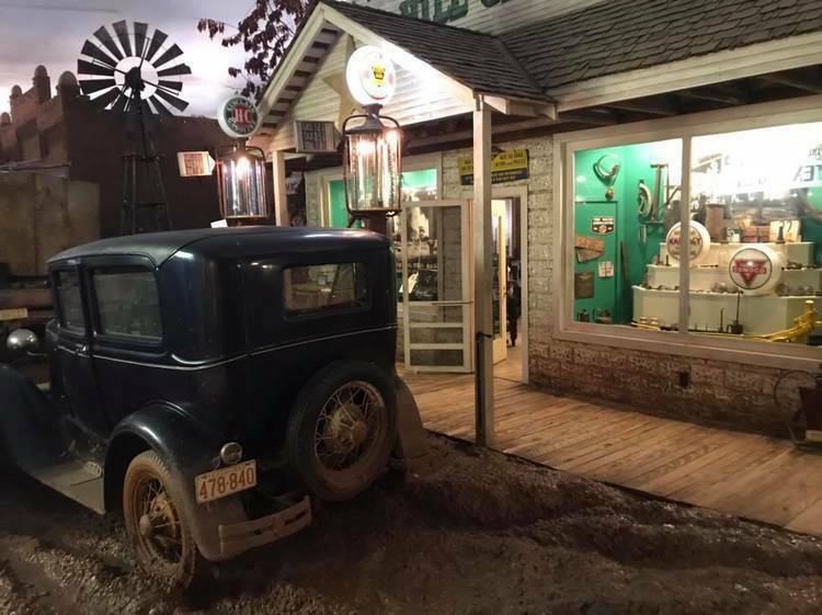 Take a look at the gasoline pumps; these are called visible gas pumps. Gasoline flows through a hose and to the car's gas tank by gravity. The car here is a 1930 Model A Ford Sedan. Note that the gas tank is located on the hood.