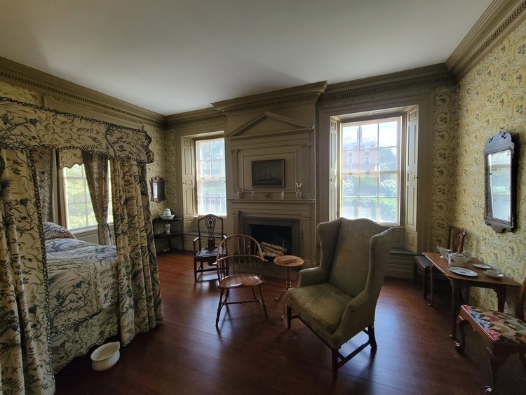 Cette chambre est considérée comme la chambre à coucher de John et Sarah. Comme plusieurs des pièces en bas, les chambres offrent beaucoup de flexibilité dans leurs utilisations. Les bains comme les petit-déjeuners pouvaient prendre place ici et on y passait la nuit, bien entendu. La moitié de l’étage est surtout utilisée pour les activités quotidiennes pendant les mois d'hiver, car ces pièces ont tendance à être plus chaudes. Ici, dans la chambre à coucher, on peut imaginer la scène de la mort de John Brown. Il meurt le 20 septembre 1803 à l'âge de 67 ans. La cause du décès « Dropsy of the Breast », qui aujourd’hui serait probablement une insuffisance cardiaque congénitale.. À sa mort, la maison restera àsa veuve, Sarah, jusqu'à sa mort en 1825. La maison restera dans la famille immédiate des Brown jusqu'en 1852, date à laquelle elle est donnée à une arrière-petite-nièce en cadeau de mariage.