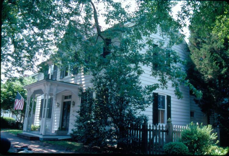 As you turn the corner onto Mulberry Street, on the right is number 207, a blue-painted cross-gable house with a front portico, built about 1888 with reused materials from an older house. The owner, Thomas H Kirby, was a shipbuilder who had apprenticed with Lambdin before the Civil War, worked in Baltimore during the war, and returned in 1865. He purchased a shipyard on the end of Carpenter Street and built a marine railway in 1875 to haul vessels out of the water. The mule that powered the marine railway was stabled in Kirby’s backyard, and it daily crossed the marsh behind his yard on a narrow plank bridge on its way to and from the shipyard.