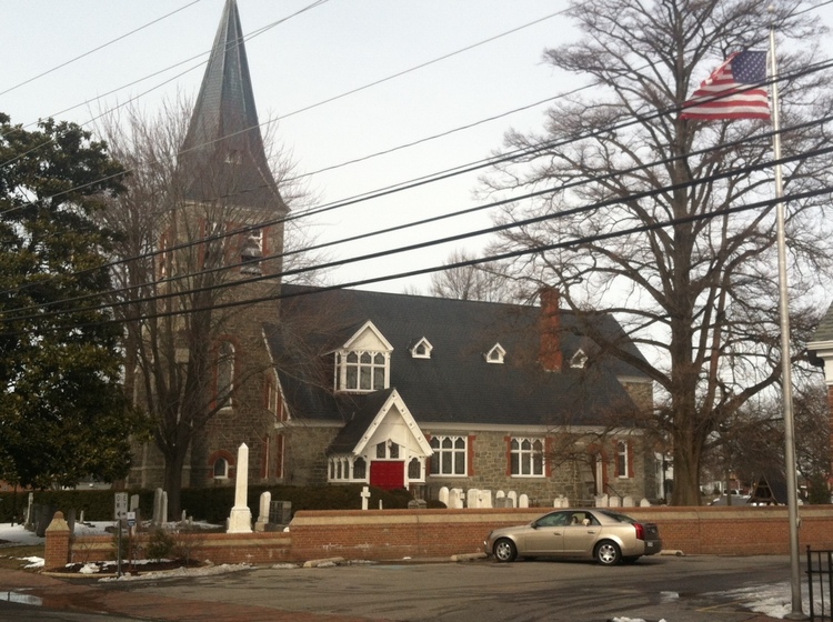 Christ Episcopal Church, on your left, is at least the third edifice built for the Saint Michaels Parish that gave the town its name. The first, a wood frame structure, was constructed before 1709. The second, a brick church, was built about 1814. The present Victorian Gothic church was designed by Baltimore architect Henry Congdon and completed in 1878, just a few years after the brick Saint Luke’s Methodist Church was built on the opposite side of Talbot Street. The contrasting exterior materials from the rough-faced granite to the half-timber, brick, and patterned slate, add interest to the form of the church, with its prominent bell tower with a chamfered pyramidal spire.