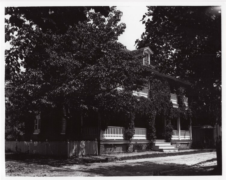 Next, on the right this two-story brick dwelling on the corner was built in 1799 and expanded in 1872, which is when the double porch was probably added. Shortly after, it became the home of Thomas Auld, the former enslaver of Frederick Douglass. Douglass visited the old man at this site, just a block up the street from where he had been taking food as a teenager.