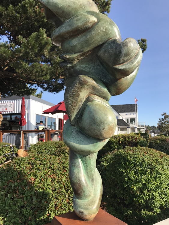 Art, or homage, Part II. Henry Nelson's Inflight seems to provide a textbook definition of incongruity. There is nothing immediately aerodynamic in this sculpture. Then again, some say Inflight evokes a key element of the Maury Island Incident story - molten slag falling from the sky. And yes, we agree plummeting, molten slag from the sky might sink, let alone damage, a boat. We'd get off the water and hide in the cliffs, too.