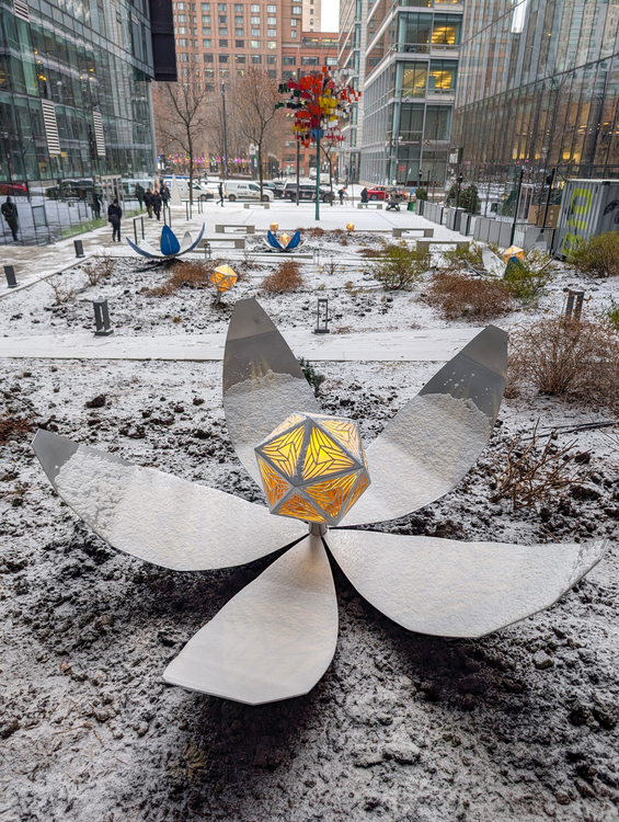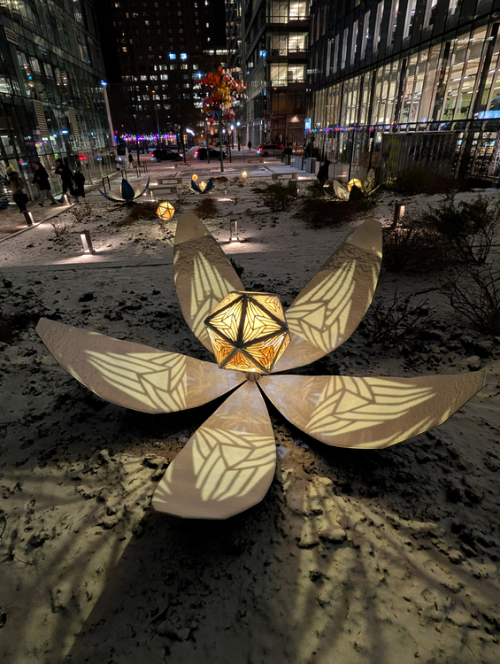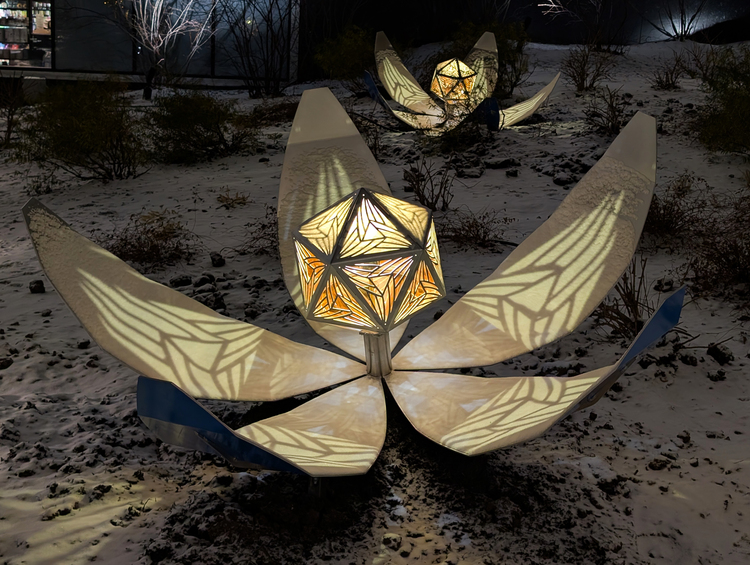 Its petals and central bud filter natural light by day and artificial light by night. Over time, these beams sculpt geometric and floral motifs across the ground and structure, giving the work a living presence that shifts and transforms throughout the hours.