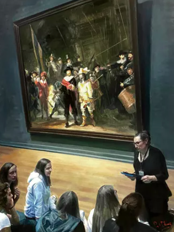 About Art Museum Talk, Cheng says, “I am a painter and naturally enjoy going to art museums very much. I am fascinated by everything there, including artworks, museum architectural design and interior decoration landscapes, all the activities of visitors, and the staff inside. Everything seems so beautiful and full of cultural atmosphere. A group of students are paying attention to the museum interpreter's explanation of the painting Night Patrol by the master painter Rembrandt.”