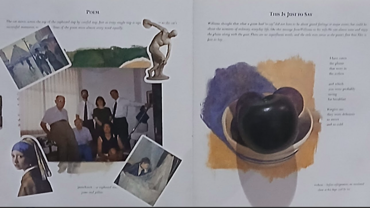 In this collage Mr. Ungar pays homage to William Carlos Williams and his poetic ideals. Williams believed that the poet should convey meaning through objects, scenes, and sensory details, not through commentary; as summed up in his phrase, “No ideas but in things,” from his work Paterson. Expressed differently William Carlos Williams believed in turning the ordinary into the poetic. Ironically, Mr. Ungar turns the tables, so to speak, and uses an “ordinary” anthology of Williams’s poems as the back drop of his art. The book is opened to “This is Just to Say” about the poet eating plums in the fridge, adorned with an ordinary plastic plum. On the facing page the verses to “Poem” are covered with a family photograph of Mr. Ungar, his siblings, and great-aunt and -uncle. The photograph, exudes an artistic, poetic quality. The view cannot help but notice the angles formed accidentally by the lamp and Uncle Ernest’s posture, not to mention, humorously, how high up his pants are. In addition, like in many artworks the viewer is left to wonder, in this case, “Who took the picture?” Here Mr. Ungar is saying, even an innocuous family photograph can be poetically artistic; and to further enhance this theme he secures it with simple stickers of masterpieces. Lastly, Mr. Ungar has a little fun, by pairing his Uncle Ernest with William Carlos Williams who have a slight but recognizable resemblance.