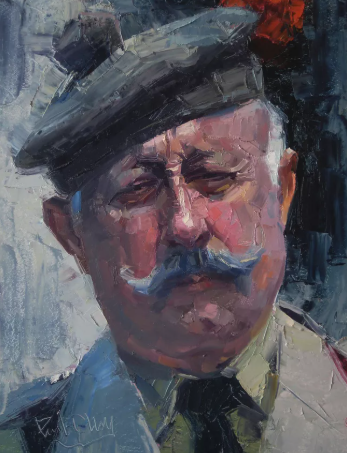 Old Man at the Parade is reminiscent of the style of Paul Cezanne. The painter deftly captures the aged tiredness in the man at the same time capturing an unparalleled pride. Here standing in his uniform, the painter provokes the viewer to wonder about the war-time past of the subject. In addition, the image of the lone man, whose comrades have long gone to the great battlefield above, is thematic of Oliver Wendell Holmes’s “poignant poem” “The Last Leaf.” Ironically the most important feature of this painting may be the title; Cheng did not choose a pretentious title, but instead chose a title that framed the subject and unseen setting for us. Consider, without the title the viewer could easily have overlooked the man’s uniform much less gathered the context and meaning conveyed by it.