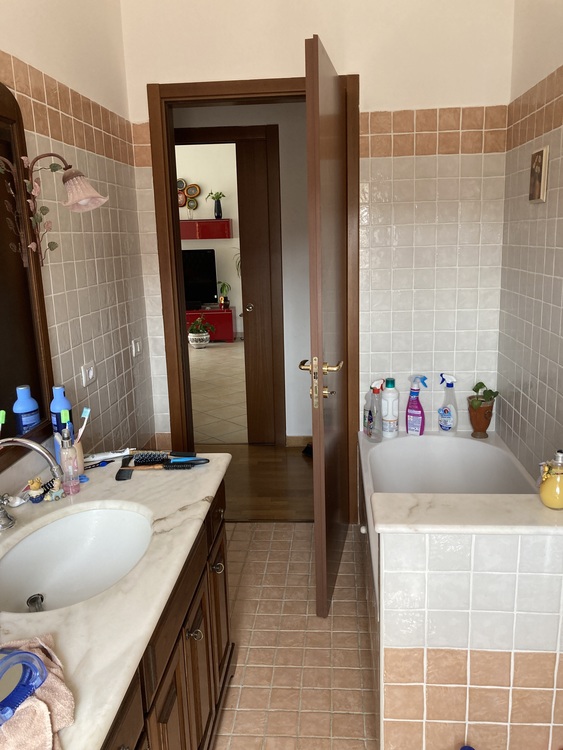 Bagno con vasca e tanta luce. Rosa è il colore delle piastrelle che hanno ispirato un arredamento classico con marmo rosa