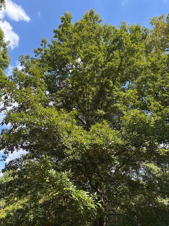 This tree is known as the Shingle Oak or the Quercus imbricicaria, named for its use in making cabin shingles by early settlers of the midwest. They can liveĀ up to 200 years and are quite symmetrical in form. The leaves of the Shingle Oak are dark green and leathery with a slightly hairy texture and they persist on the tree throughout the winter, even after dying. These trees provide great nesting spots for songbirds and their acorns, small, striped, and dark brown, are beloved by woodpeckers and other birds. Mature bark of the Shingle Oak resembles that of the Pin Oak, flat and grayish brown, developing broad ridges with age.