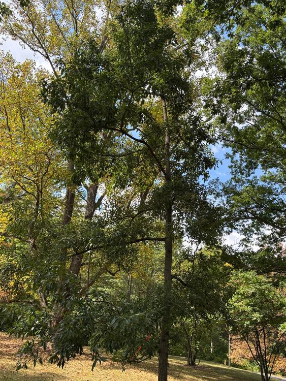 The Sawtooth Oak, or Quercus acutissima, is native to East Asia and often used ornamentally. This tree grows rapidly, reaching heights of 40-60 feet within 20 years. Notice its dark, glossy green leaves in summer, which turn a striking golden brown in fall. Feel the distinctive saw-like edges of the leaves that give the tree its name. Its bark is rough and deeply furrowed; touch the texture to feel its ruggedness. In spring, it produces yellow-green flowers that attract many pollinators. These flowers develop into acorns, a crucial food source for deer, squirrels, and birds.