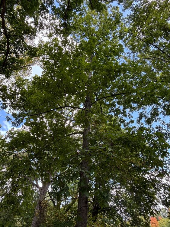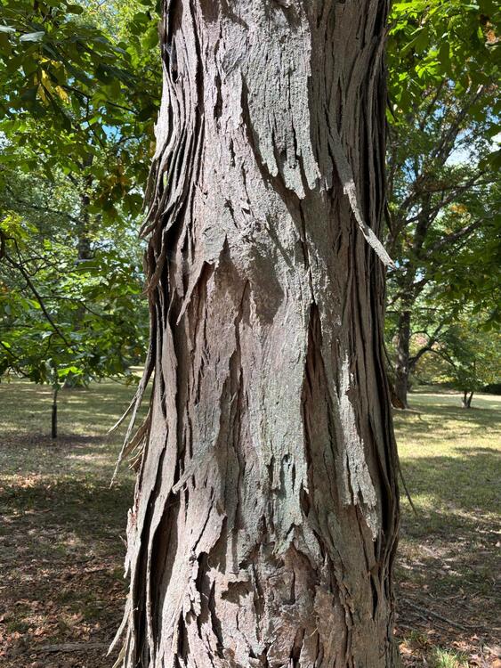 Here we have the Shagbark Hickory, or Carya ovata, a tree celebrated for its distinctive bark and valuable wood. One of the most common hickories in the Midwest, the Shagbark Hickory is highly regarded for its tough, strong, dense wood, which is still used today to add that classic hickory flavor when smoking hams. In fact, it is the most commercially important hickory species in the United States. This medium-sized tree stands 70 to 80 feet tall, grows slowly, and can live for 250 years or more. Preferring rich bottomlands near streams, it can also thrive on wooded slopes and uplands. Feel the unique dark gray bark, which comes off in long, wide, thin plates that peel away from the tree at both ends, giving the tree its “shaggy” appearance. The leaves typically have 5 leaflets, smooth and yellow-green on top with a paler, lightly hairy underside, and a serrated edge. In April and May, both male and female flowers appear as drooping clusters and spikes along with the leaves. The tree produces a rounded nut with a thick, dark brown husk that splits into four sections, revealing a sweet seed that ripens in the fall.