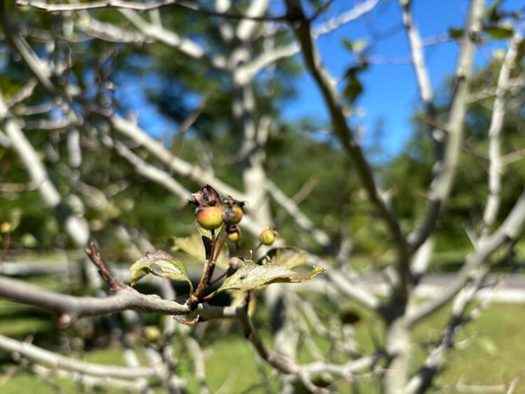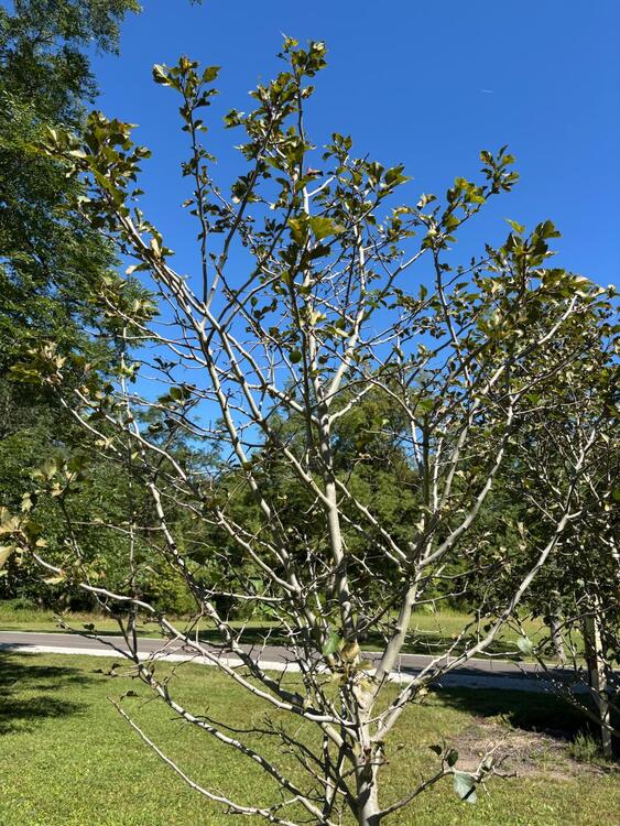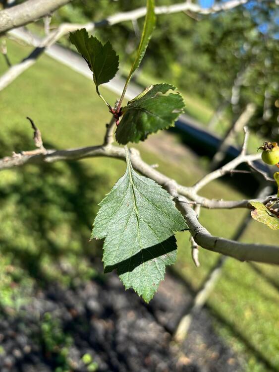 This is the Winterking Hawthorn, or Crataegus viridis 'Winterking'. This is a hardy deciduous tree known for its year-round ornamental appeal. In spring, it displays clusters of fragrant white flowers that attract a variety of pollinators. As the season progresses, the tree develops glossy green foliage, which turns a vibrant yellow in the fall. Come winter, the wide vase-shaped form with angular branches becomes a noticeable feature, especially as it's adorned with bright red berries that persist through the cold months. The Winterking Hawthorn typically reaches a mature height of 20 to 35 feet and a width of 20 to 25 feet, making it an excellent choice for landscapes seeking multi-season interest.