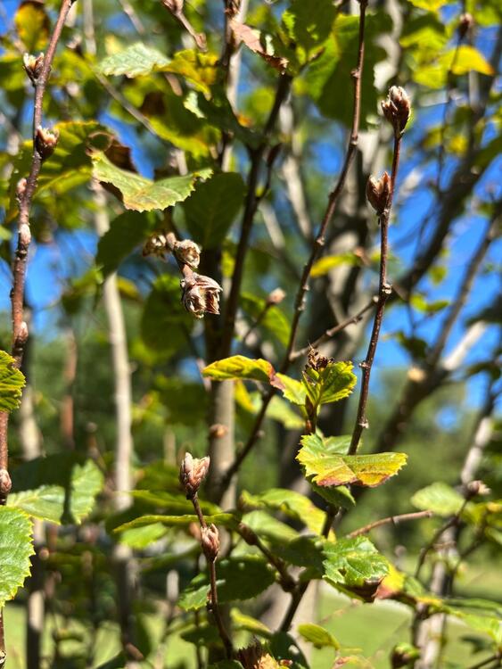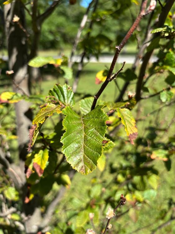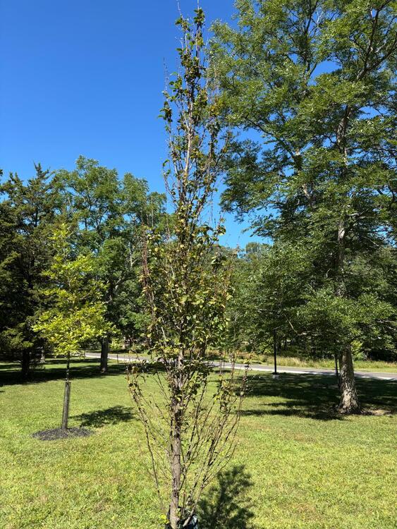 Growing here is the Frans Fontaine Hornbeam, or Carpinus betulus 'Frans Fontaine'. It is a tall, narrow deciduous tree known for its distinctive columnar shape. It typically reaches a mature height of 30 to 35 feet and a width of just 10 to 15 feet, making it ideal for tight spaces or as a vertical accent in landscapes. Its small green leaves provide a clean, uniform look through the growing season and turns a vibrant yellow in the fall, adding seasonal color.