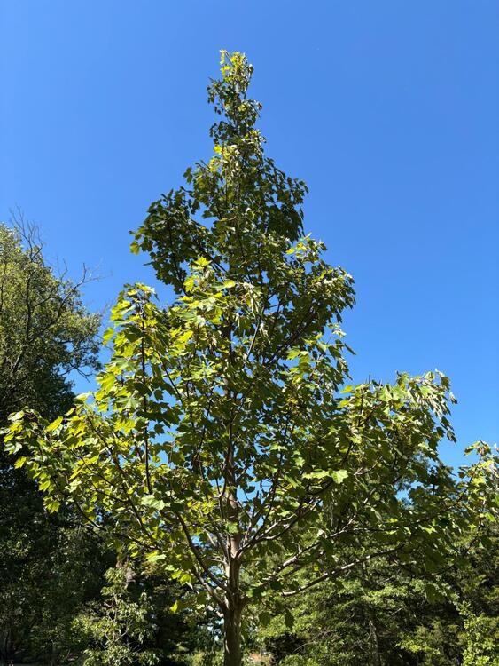 Standing before you is the Armstrong Gold Maple, or Acer rubrum 'JFS-KW78'. This tree grows with a tight, columnar oval form due to its branches growing upwards at a steep angle. This shape makes it a great choice for planting along city streets. Just as other Red Maples are, this maple can withstand a variety of environmental conditions. In the mid-spring month of April, small red flowers appear, proceeded by red-winged seeds. The leaves of the Armstrong Gold Maple turn a bright golden-orange in the autumn. It traditionally reaches a mature height of 40 to 50 feet with a width of 10 to 15 feet.