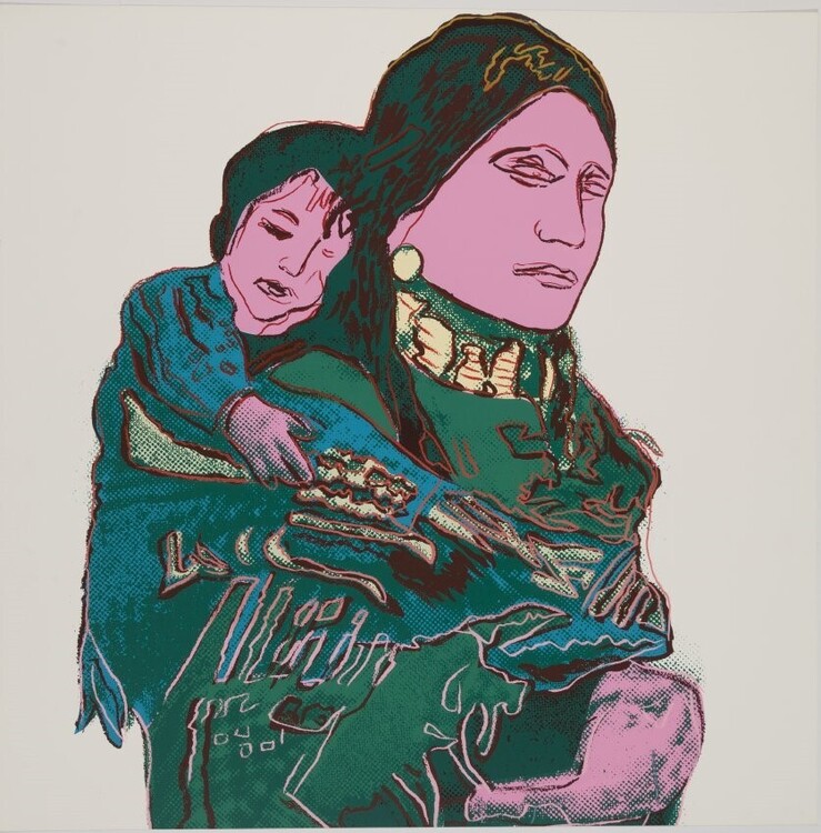This poignant image contrasts Warhol’s portrait of John Wayne and the masculine ideals of the American West. Its title, Mother and Child, recalls a canonical subject of Western art, reimagined through American mythos. The source is a 1902 postcard of the fictional “Indian Princess” named Bright Eyes, created by the Kickapoo Indian Medicine Company, which employed Native performers—often from Eastern tribes—to add authenticity to traveling spectacles promoting its “tonics.”