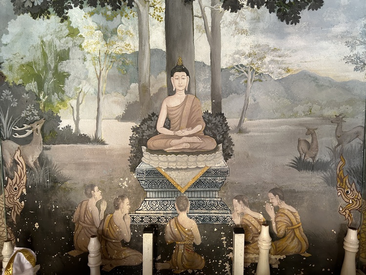 Whenever you see artwork depicting The Buddha teaching five (5) individual Students, this is depicting his very first Teaching of The Four Noble Truths. Sometimes the artist will depict one of the first five (5) Students with gray hair representing his previous Teacher. This artwork does not show that aspect of his life story, however, you might see that in other artwork.