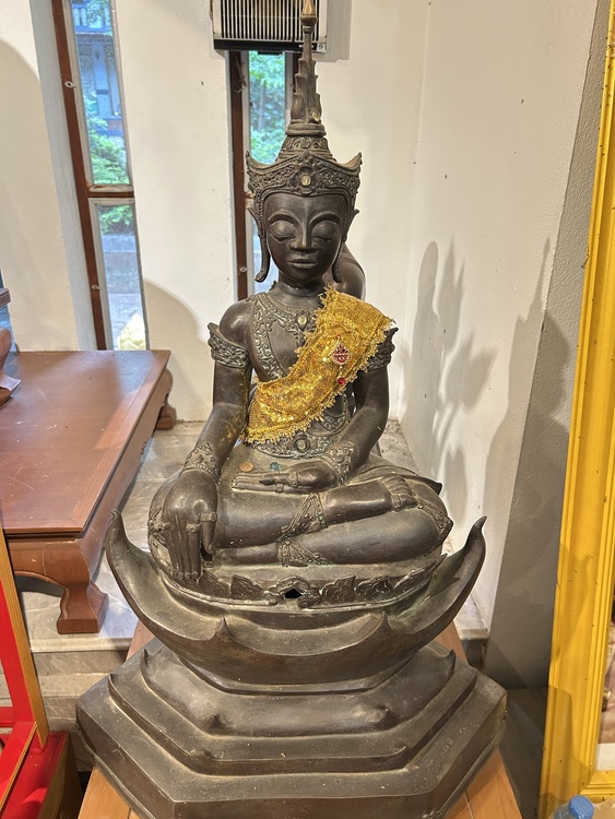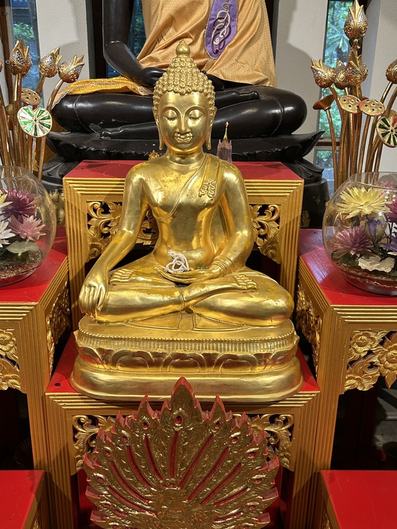 Looking at the main altar, if you look to the right, you will see a decorative black statue of The Buddha. This statue is representing the Lanna style of artwork, which is ornate. Sometimes, you will see very intricate depictions of The Buddha wearing fancy clothing, even with golden trim. This is not how The Buddha actually dressed during his lifetime as The Buddha but, it is how people were choosing to represent him artistically during the timeframe of the Lanna Kingdom.
