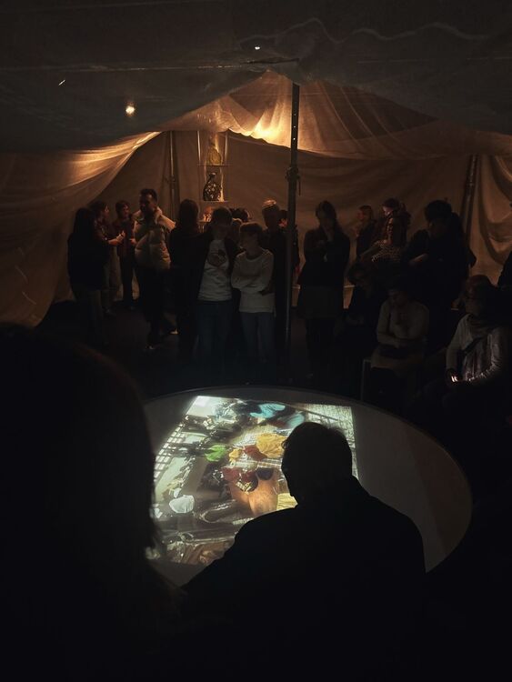 “Printing photographs always turns them into unique art pieces, but here we didn’t want that. The digital format allows a different kind of viewing experience. The projection with water creates a fading effect, almost like a swipe, so people spend more time looking. It’s similar to a screen, and it creates a collective experience: the glowing light reflects on people’s faces, and there’s a shared gaze rather than an individual one.”