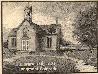 Library Hall could have qualified as Colorado's first public library but technically it was originally a reading room and not a lending library. Mrs. Elizabeth Thompson (1821-1899) arrived in Longmont in June 1871 from New York City, bought the property and had the public Library Hall building constructed there. She supplied 300 volumes to the Library and also a large collection of art prints from the Thompson collection. At the same time, an organ, a bell for the bell tower, and a flag were given by Colonel Pratt, one of the original organizers of the Colony.