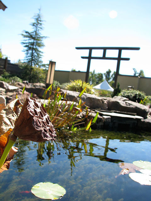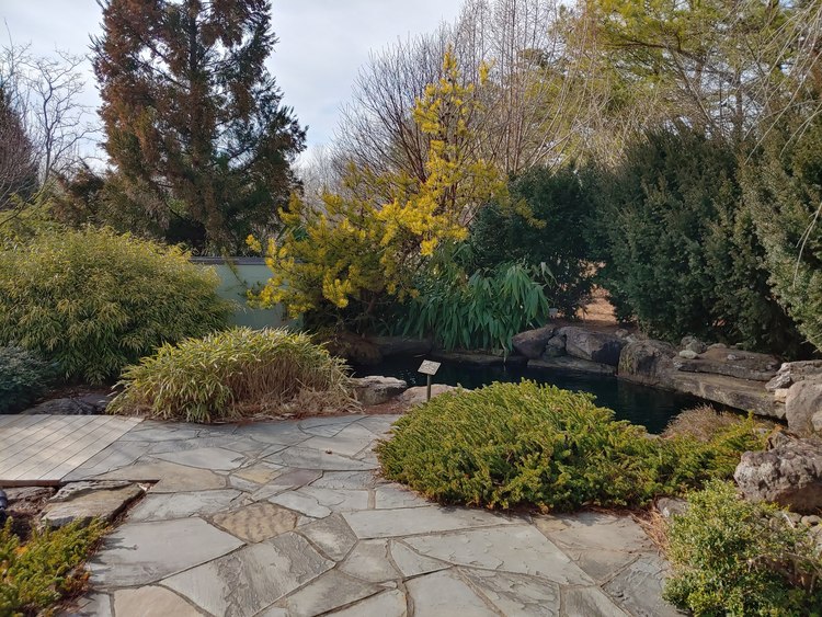 This garden is designed in the traditional Japanese style representing peace and tranquility. This style of garden hints to ancient landscapes that highlight the natural beauty of nature without overly ornamental design. There are no showy flowers in this garden, it is mostly made of evergreen shrubs. Evergreen shrubs stay green and keep their foliage year round unlike deciduous plants that drop their leaves. The use of opposite elements are highly used in this garden, they include contrasting textures, the use of wet and dry elements, and more. These elements can be read about in depth on the sign outside of the garden.