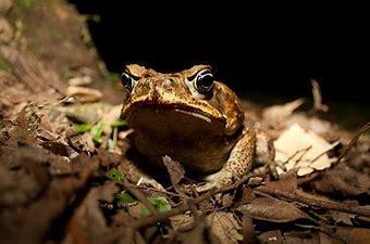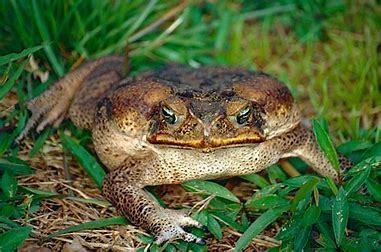 The cane toad (Rhinella marina), also known as the giant neotropical toad or marine toad, is a large, terrestrial true toad native to South and mainland Central America, but which has been introduced to various islands throughout Oceania and the Caribbean, as well as Northern Australia. The cane toad has poison glands, and the tadpoles are highly toxic to most animals if ingested. Its toxic skin can kill many animals, both wild and domesticated, and cane toads are particularly dangerous to dogs. When the toad is threatened, its glands secrete a milky-white fluid known as bufotoxin. Components of bufotoxin are toxic to many animals; even human deaths have been recorded due to the consumption of cane toads.
