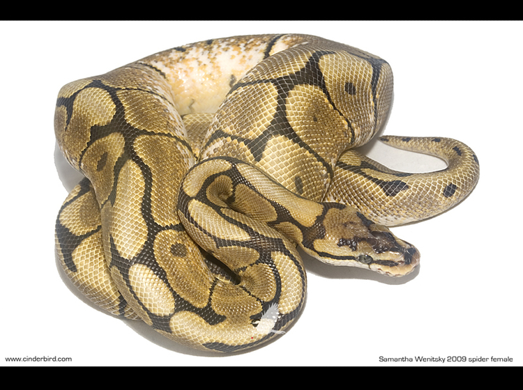 The ball python (Python regius), also called the royal python, is a python species native to West and Central Africa, where it lives in grasslands, shrublands and open forests. This nonvenomous constrictor is the smallest of the African pythons, growing to a maximum length of 6 feet.